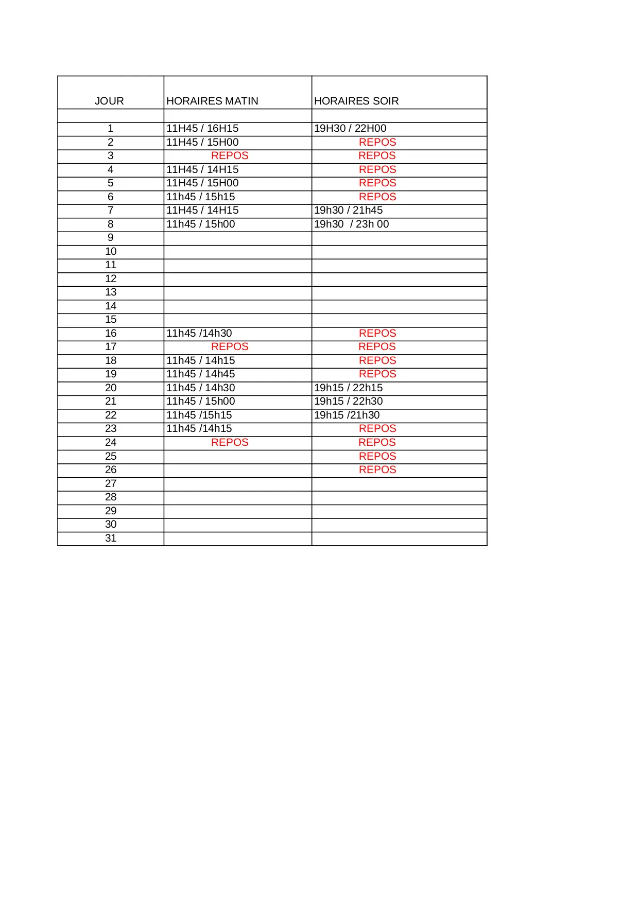 repos 19h15 16h15 22h00 11h45 heures 14h45 15h15 14h15 15h00 19h30 21h45 matin horaires 14h30