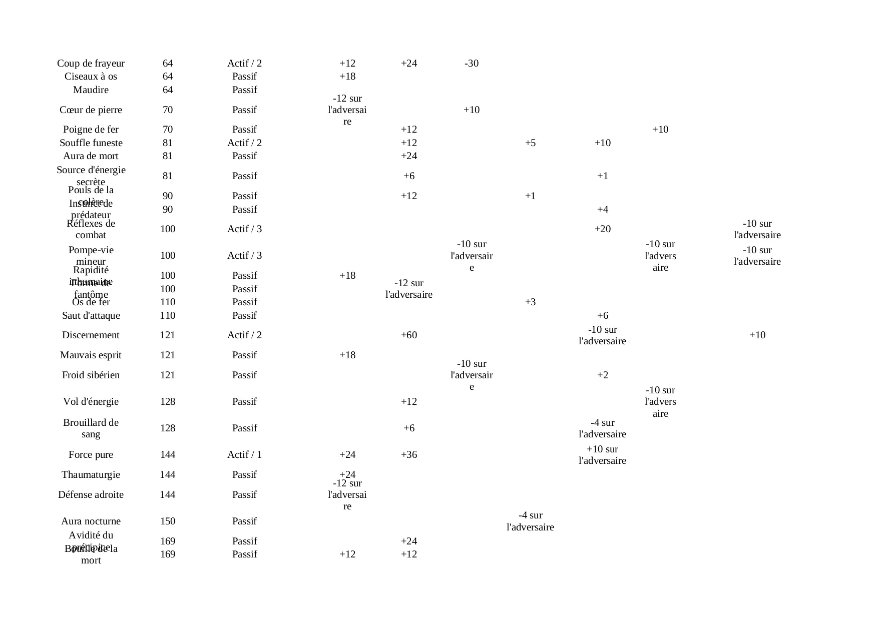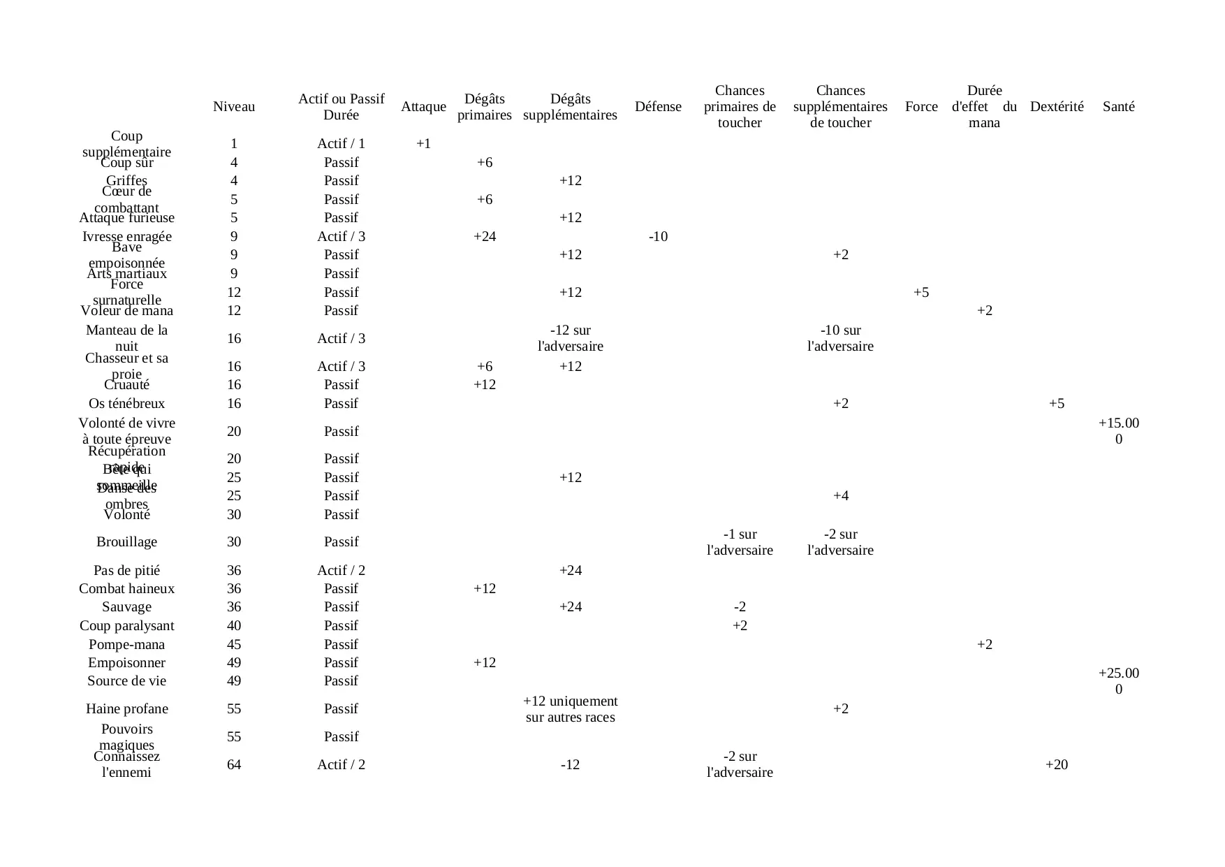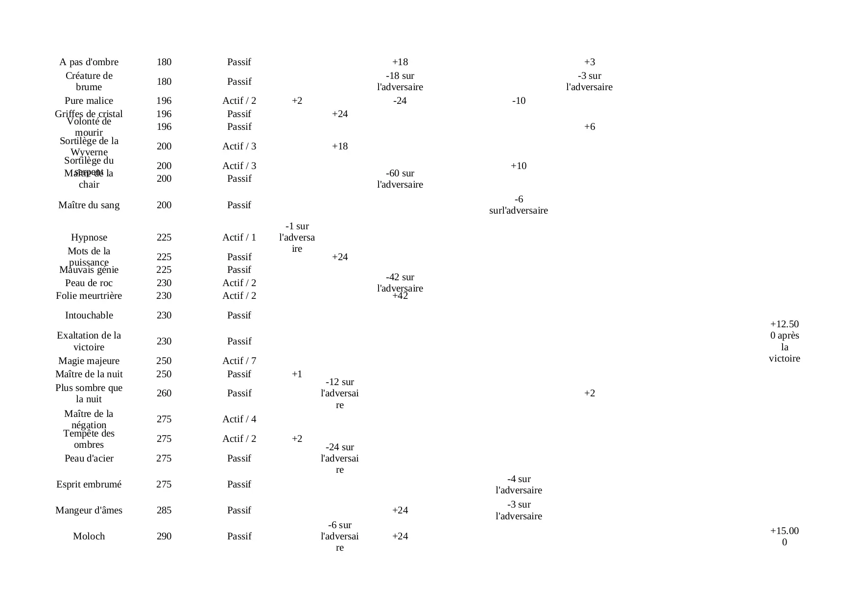 duree maetre griffes combat adversaire attaque pompe esprit supplementaire victoire passif actif volonte mauvais ombres