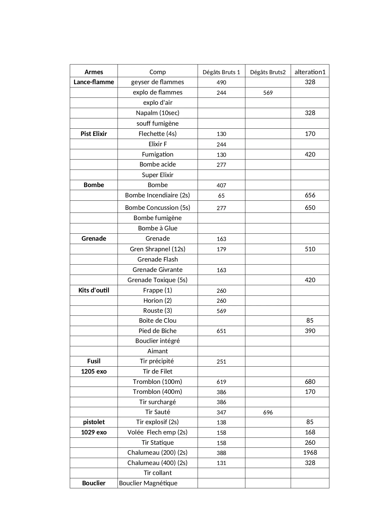 bouclier tromblon precision fumigene elixir defense explo grenade stack armure degats bonus puissance point bombe