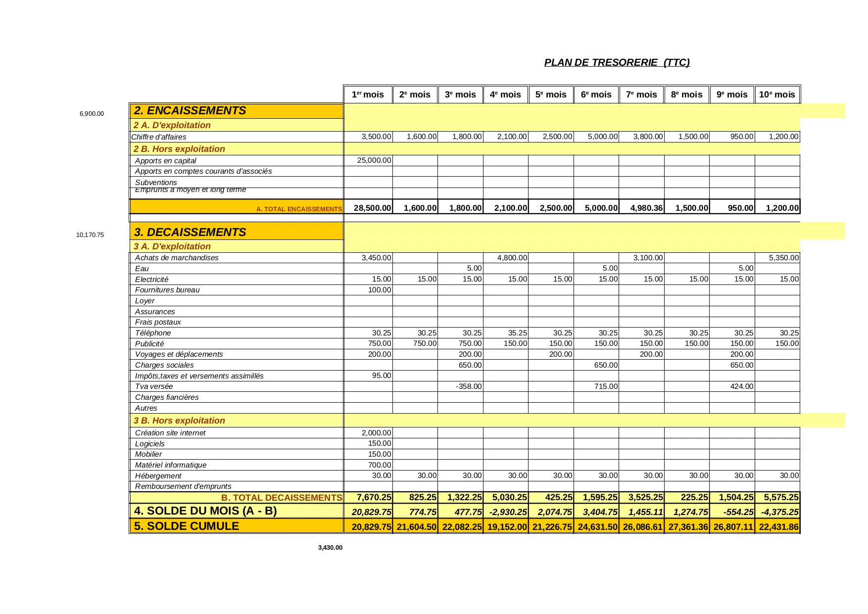 decaissements materiel encaissements mobilier informatique solde apports creation exploitation charges total autres fiancieres internet emprunts