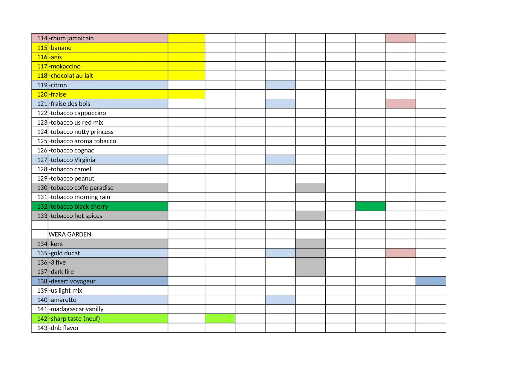 black creme cherry banane banana virginia cappuccino vanilly caramel amande chocolat canelle desert tobacco honey