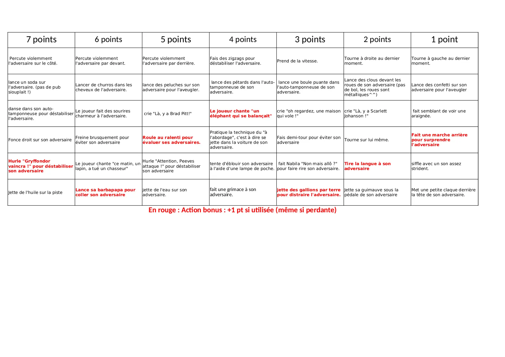 violemment eviter tamponneuse chante joueur tourne aveugler roues hurle destabiliser jette percute points lance adversaire