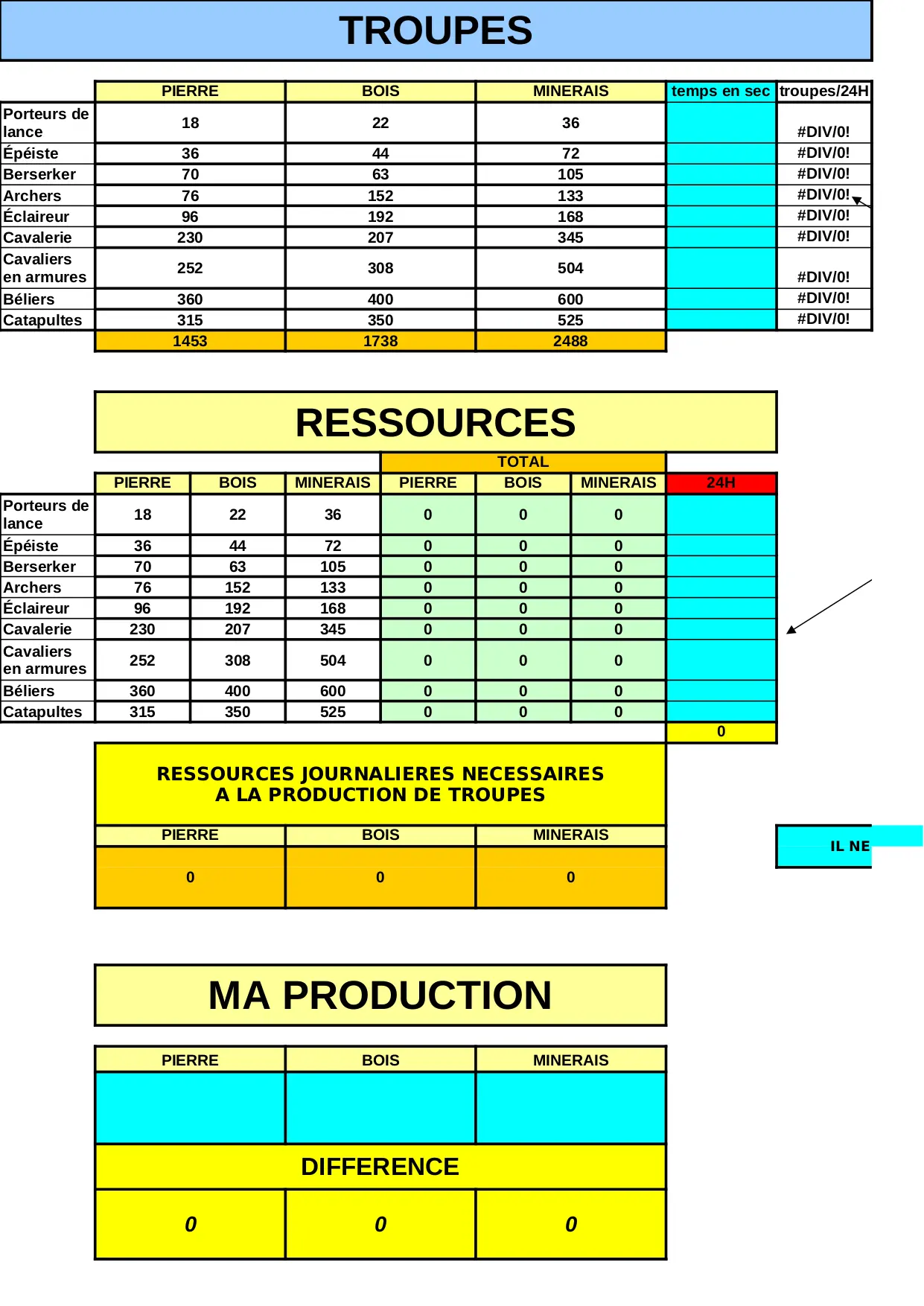 ressources production pierre troupes lance eclaireur porteurs catapultes epeiste beliers cavaliers cavalerie berserker armures minerais