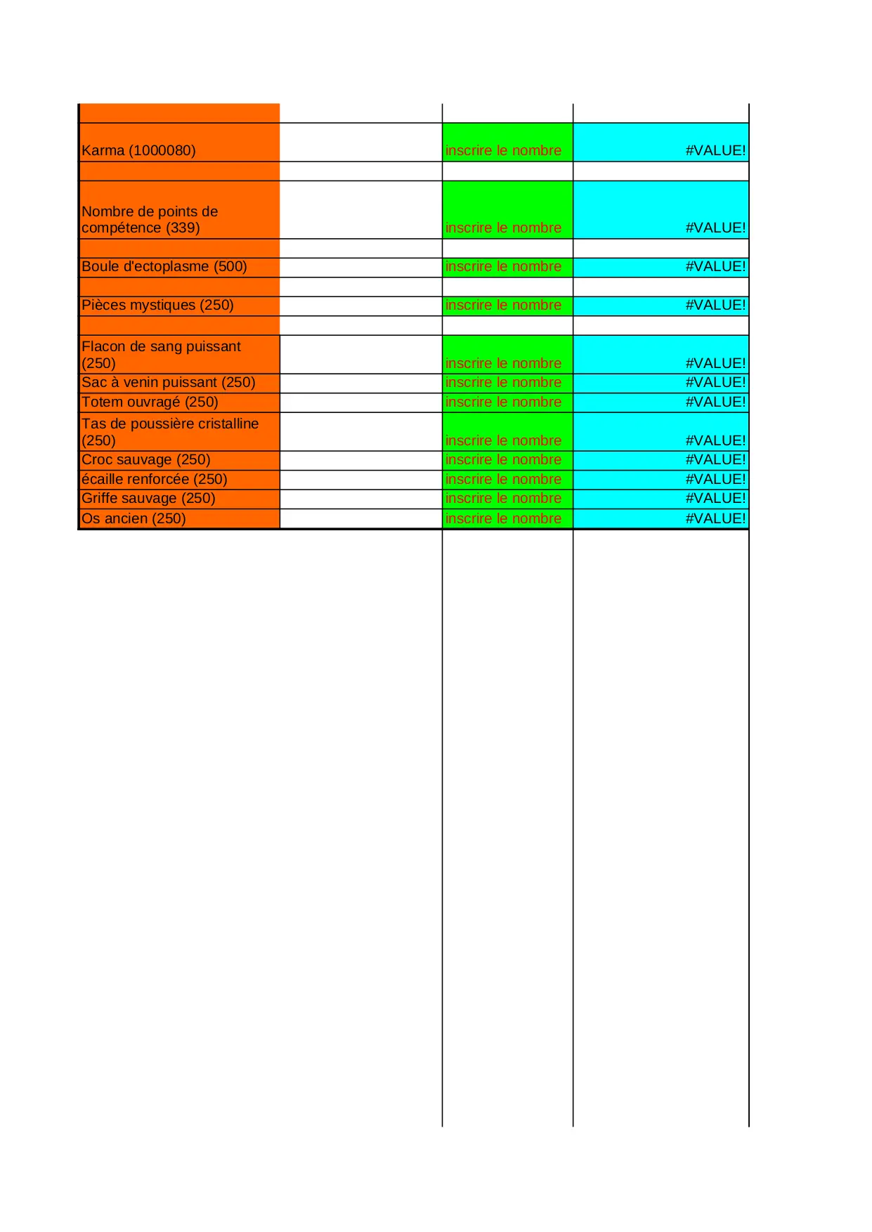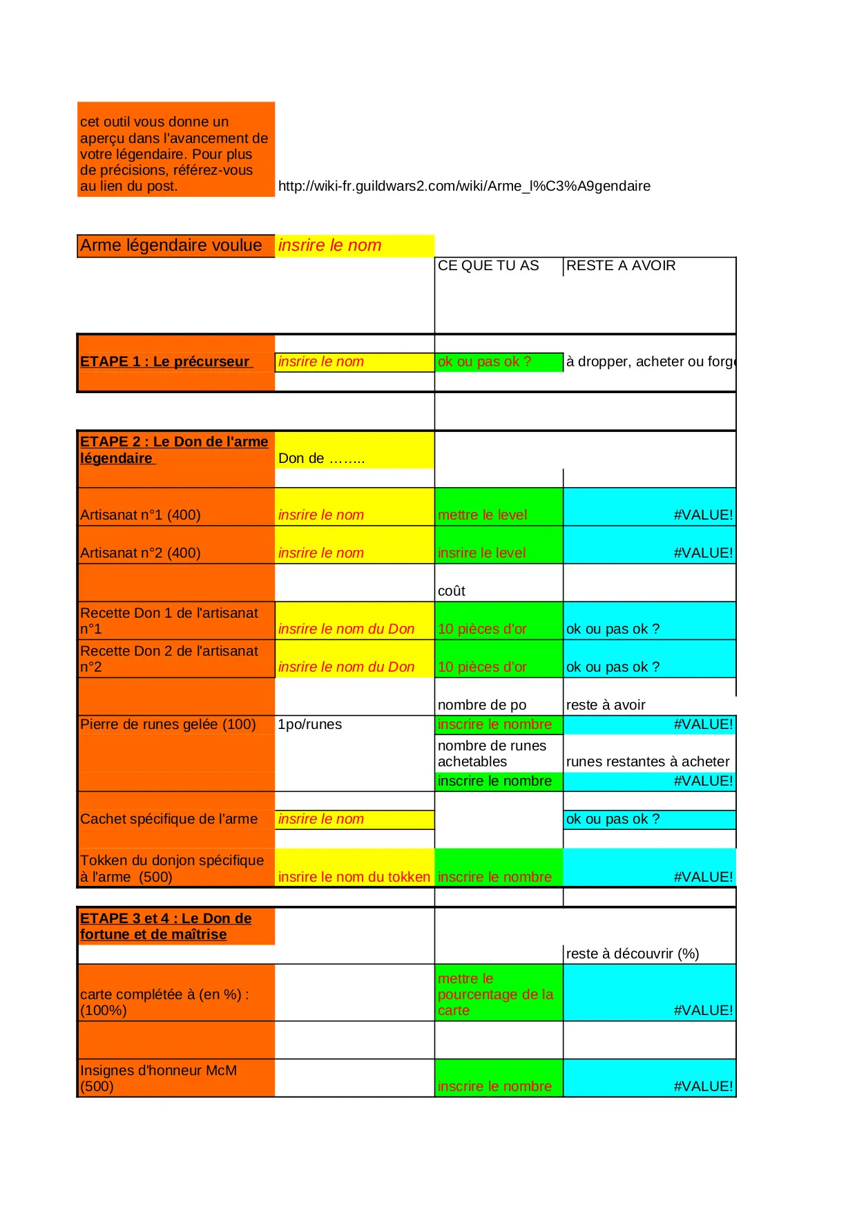 outil pour la création d'un arme légendaire (XLS)