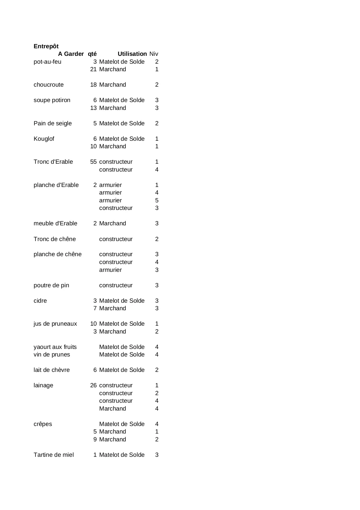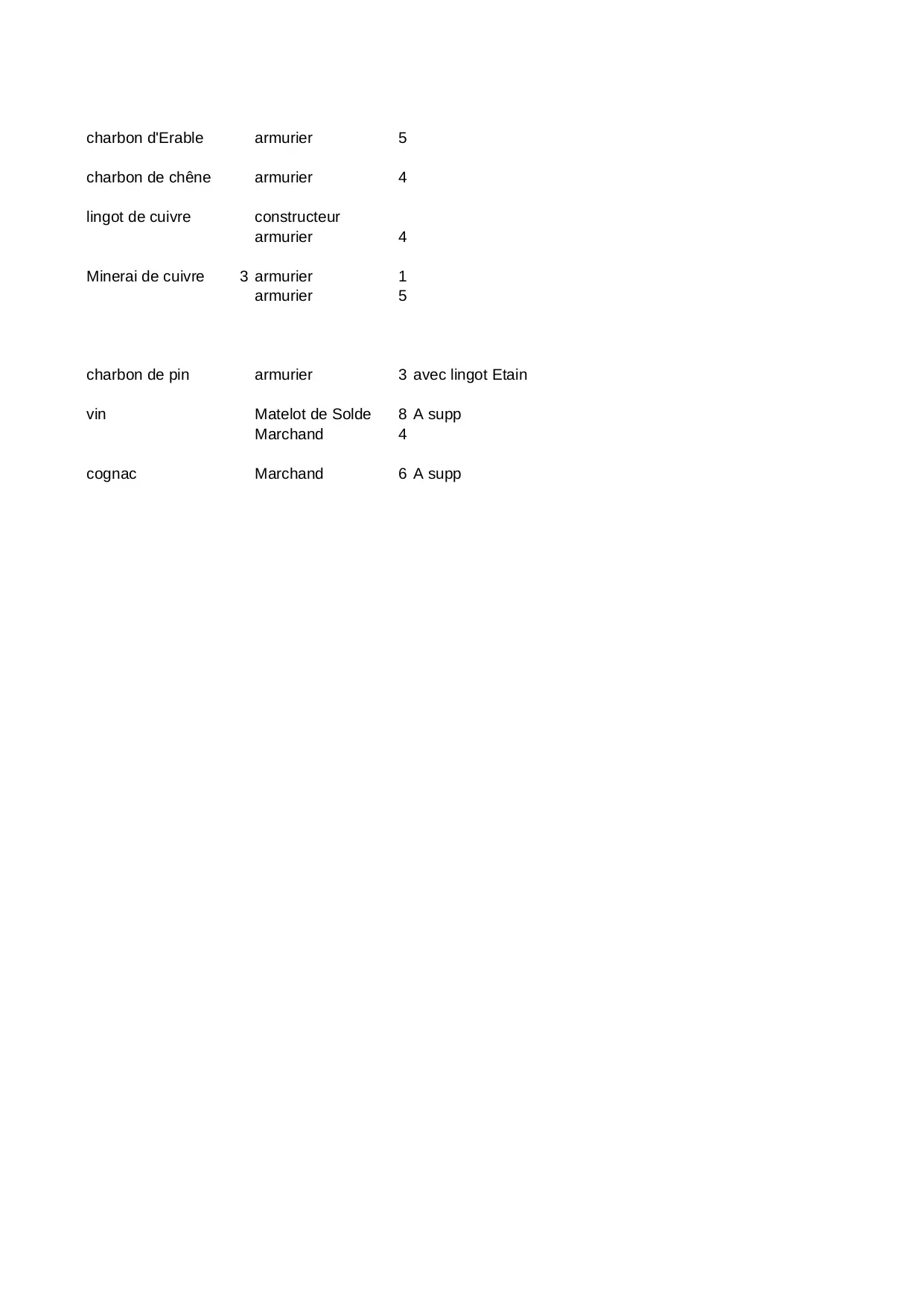 erable lingot crepes armurier cuivre chevre matelot planche chene solde tronc lainage charbon marchand constructeur