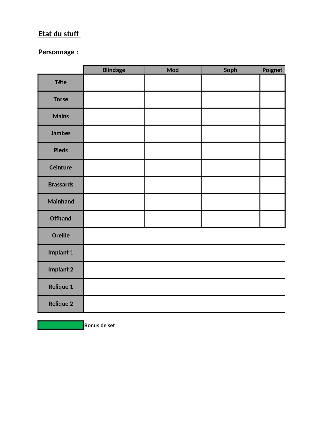jambes brassards stuff oreille relique implant canon pieds ceinture mainhand amelioration mains offhand torse personnage