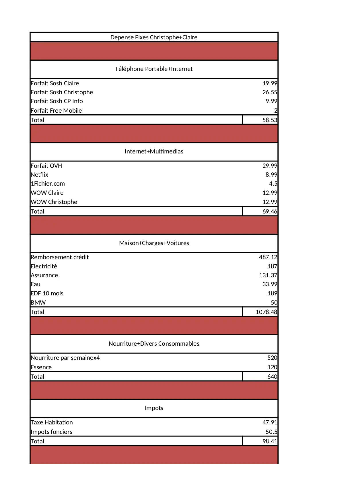 forfait christophe habitation semainex4 internet divers nourriture fonciers claire impots total electricite essence depense consommables