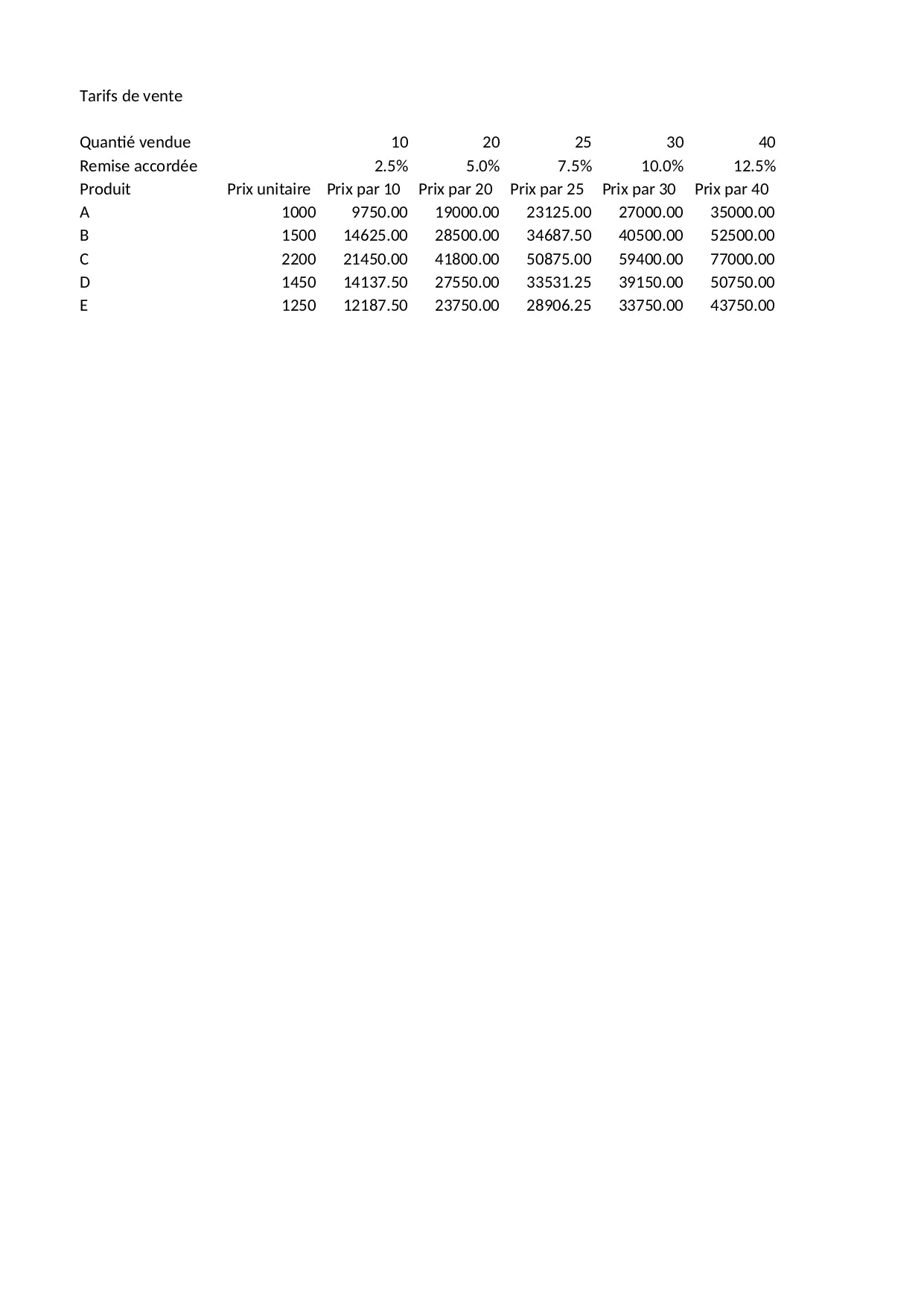 vendue tarifs produit vente unitaire quantie remise accordee