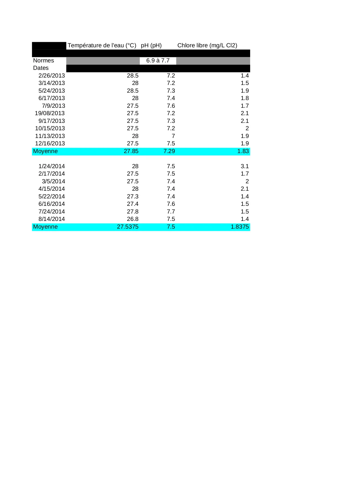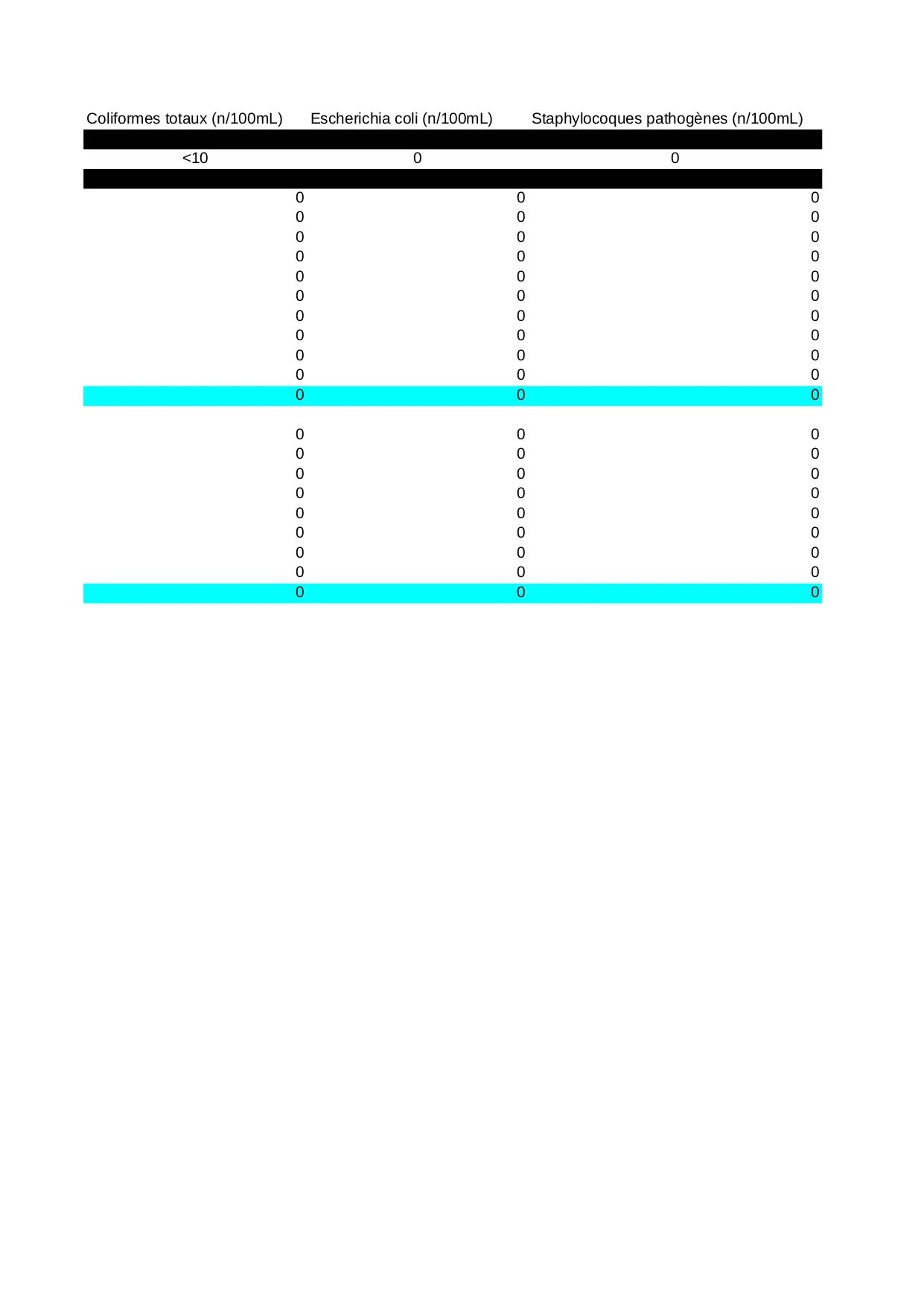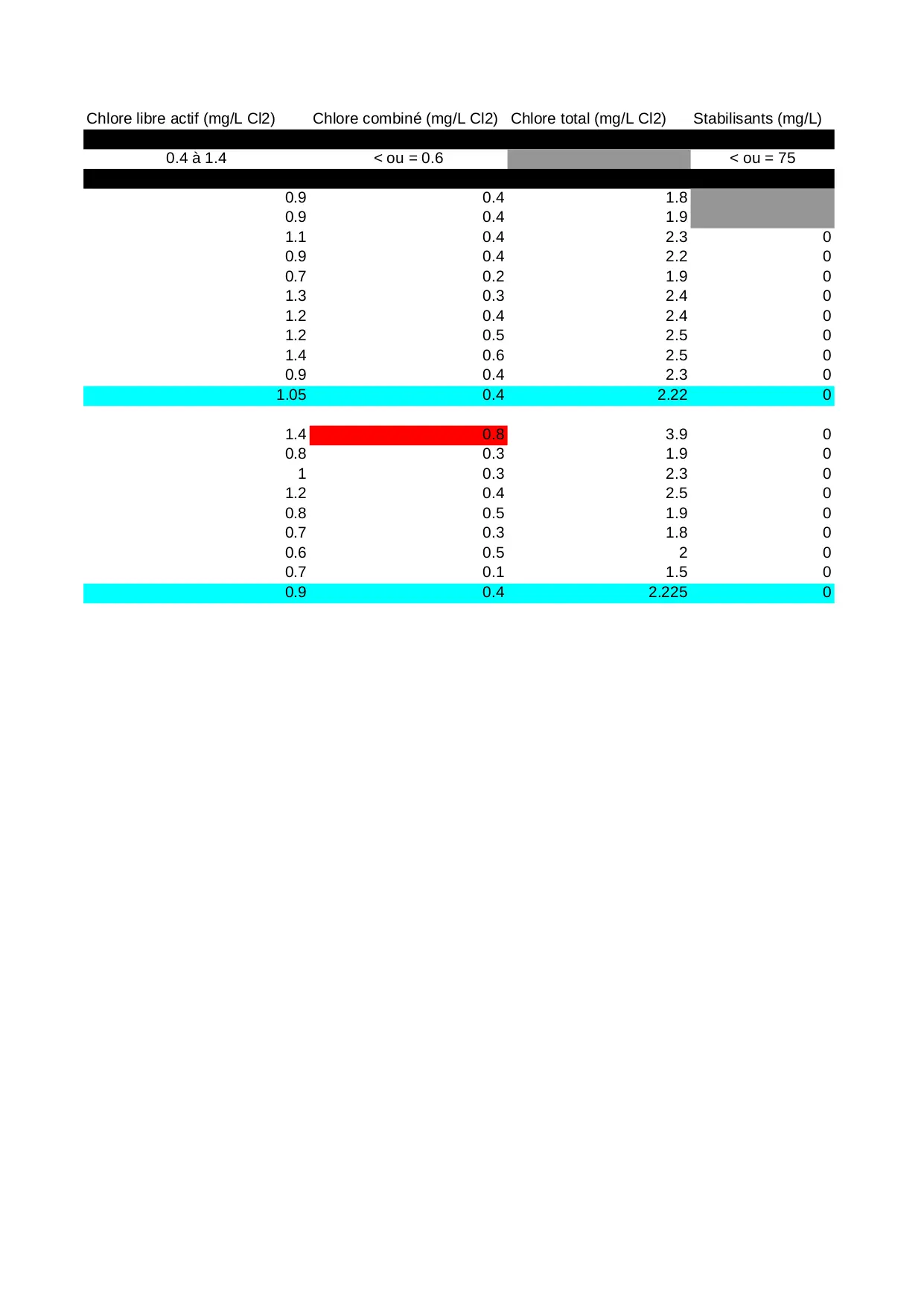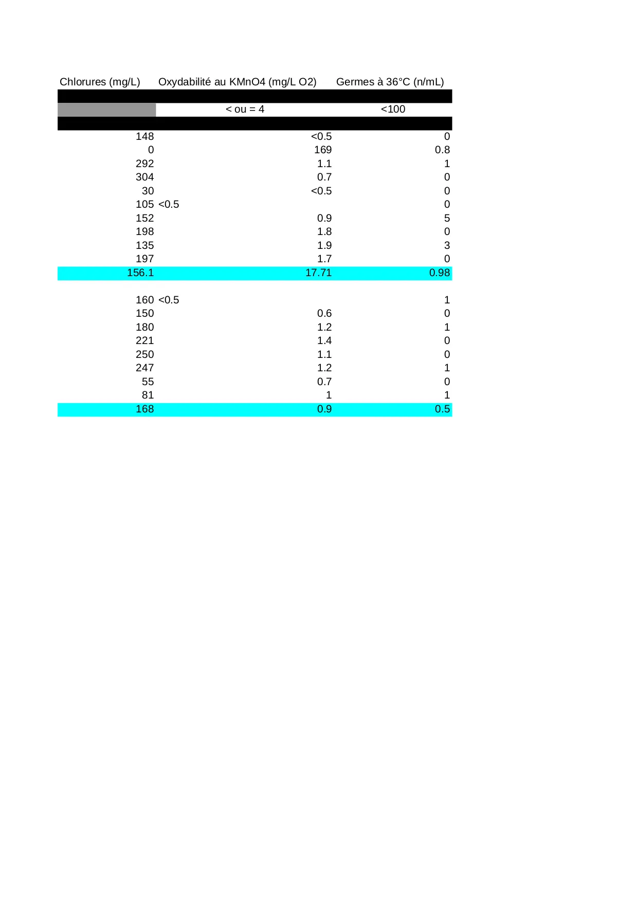 pathogenes pseudomonas oxydabilite chlore chlorures staphylocoques kmno4 100ml temperature totaux aeruginosa escherichia libre coliformes germes