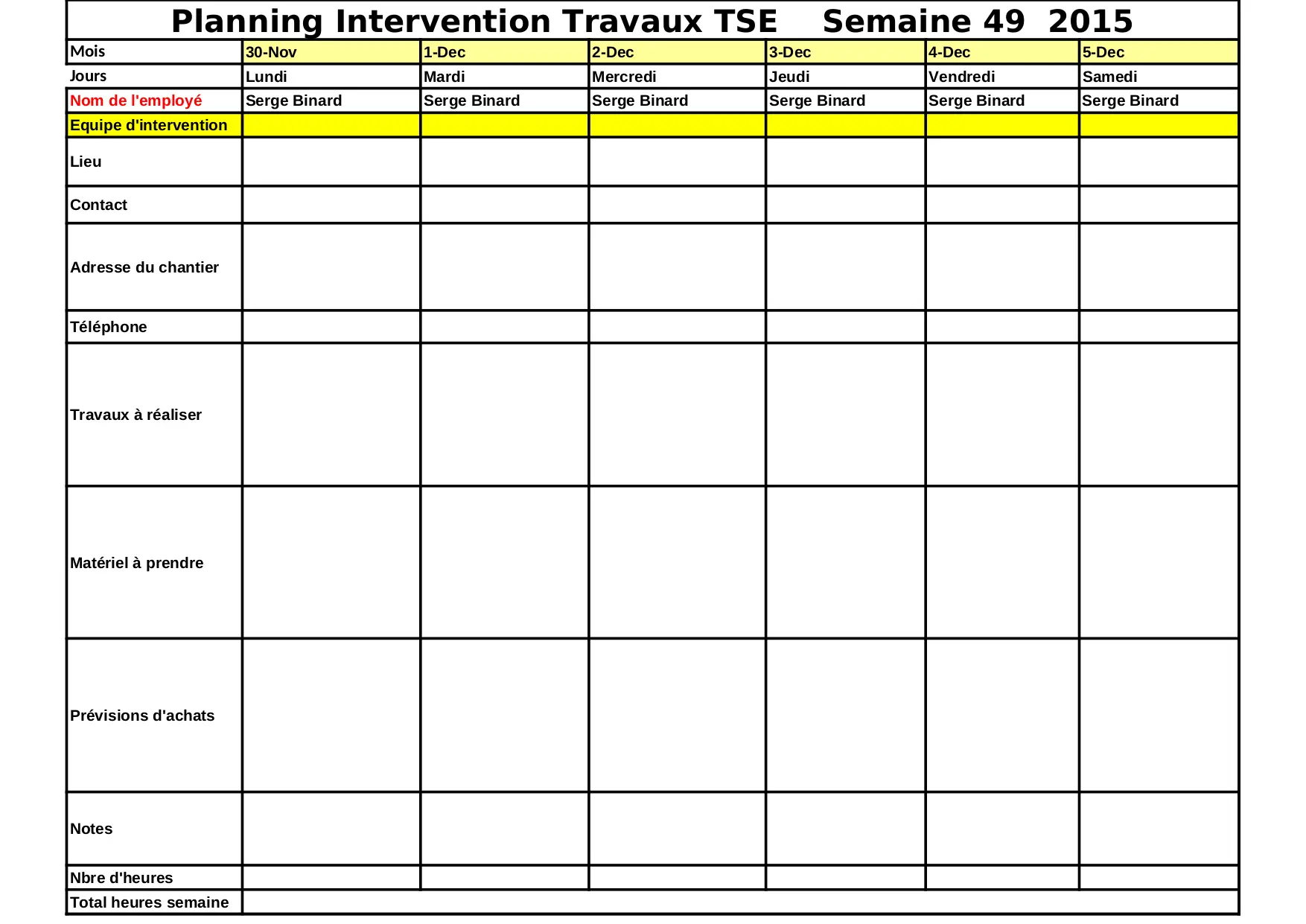 Planning Travaux Serge 1ère semaine de Décembre 2015 (XLS)