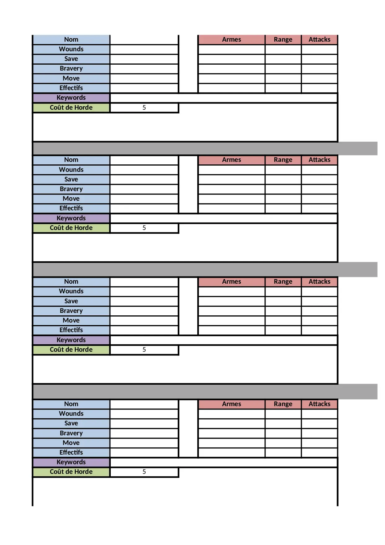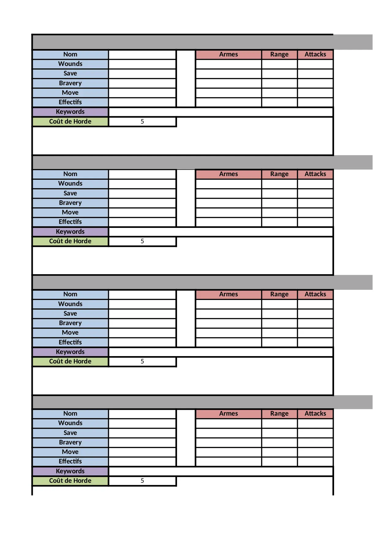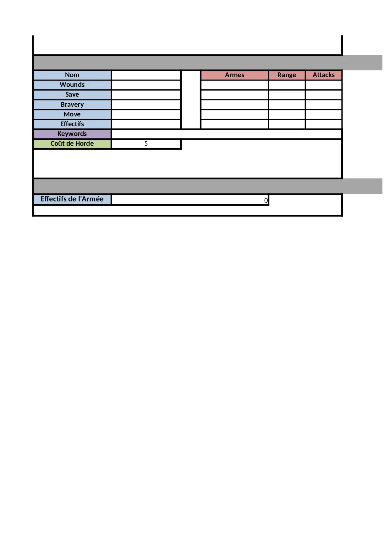 armes attacks wounds range valeur armee speciales damage keywords horde effets effectifs wound capacites bravery