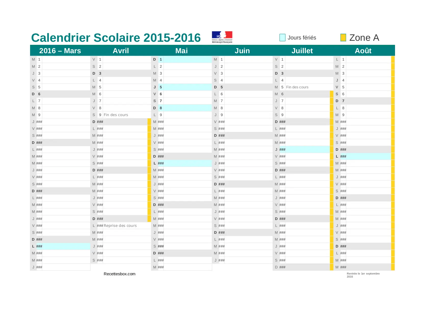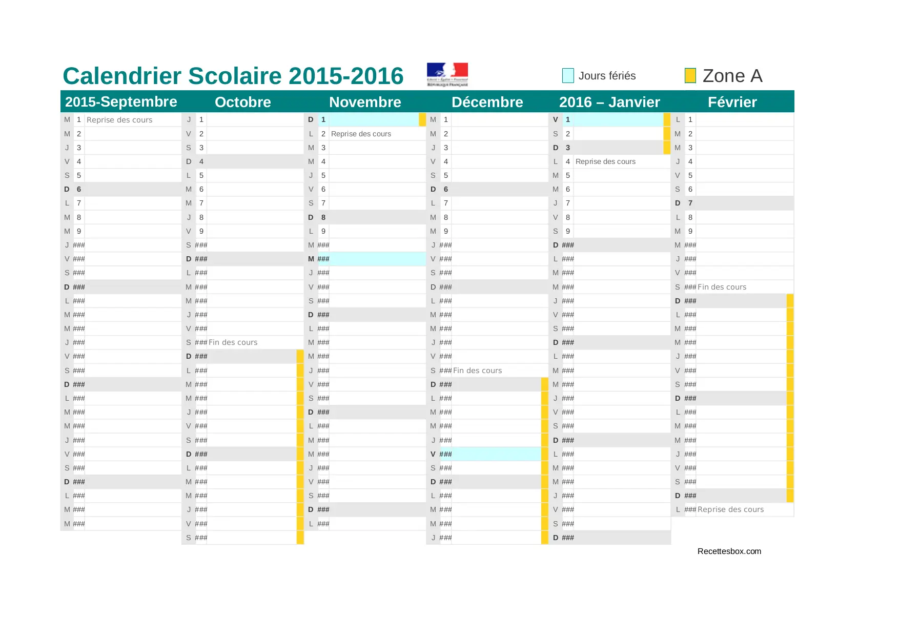 novembre reprise scolaire fevrier recettesbox jours janvier decembre cours octobre septembre feries calendrier