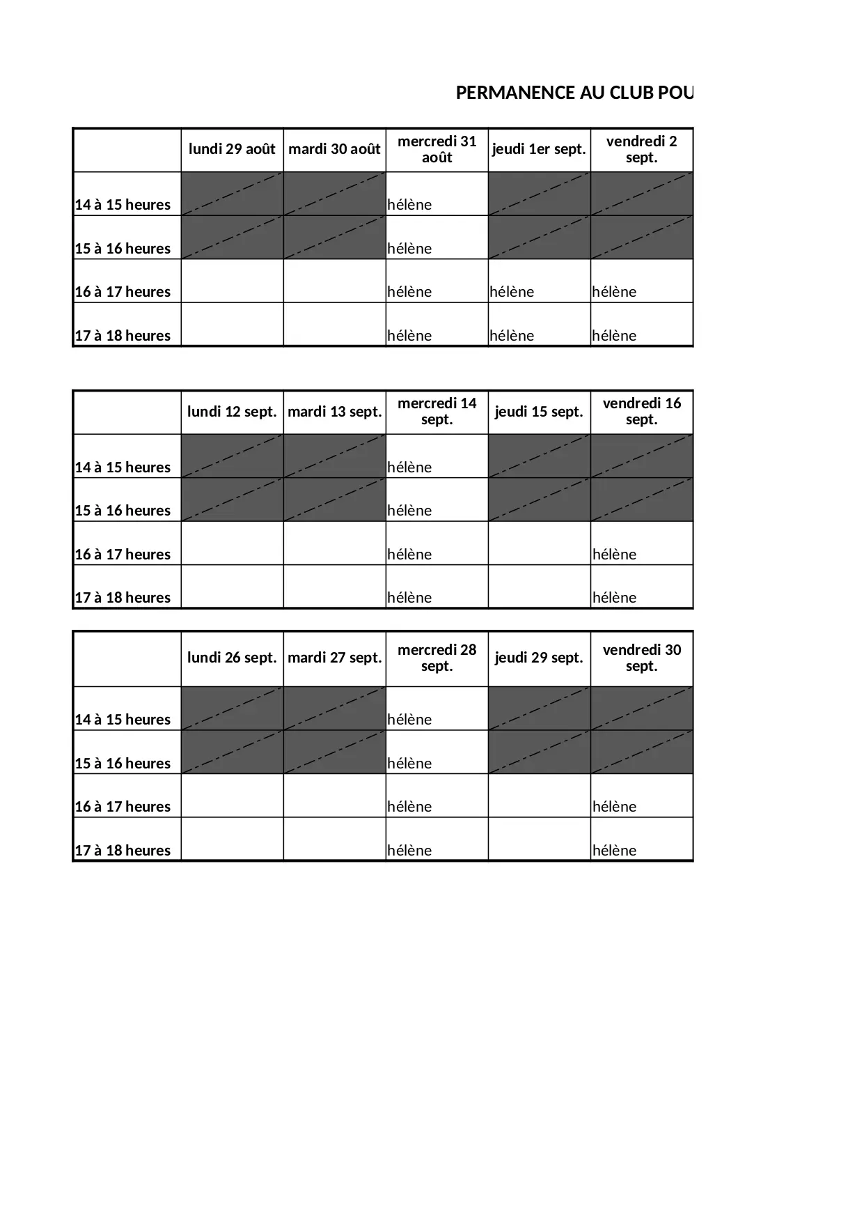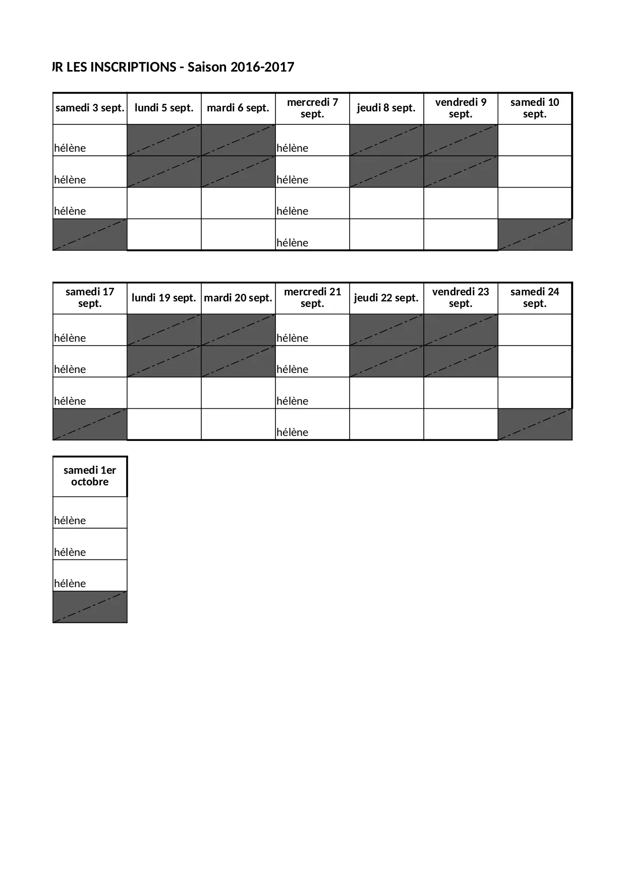 mardi mercredi vendredi jeudi octobre helene samedi lundi inscriptions heures saison permanence