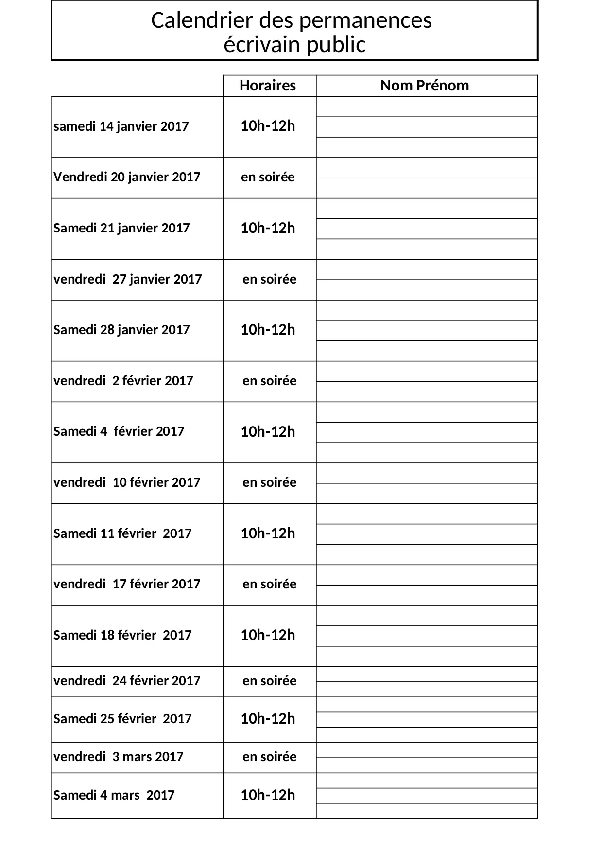 public ecrivain fevrier prenom janvier samedi calendrier soiree permanences horaires vendredi