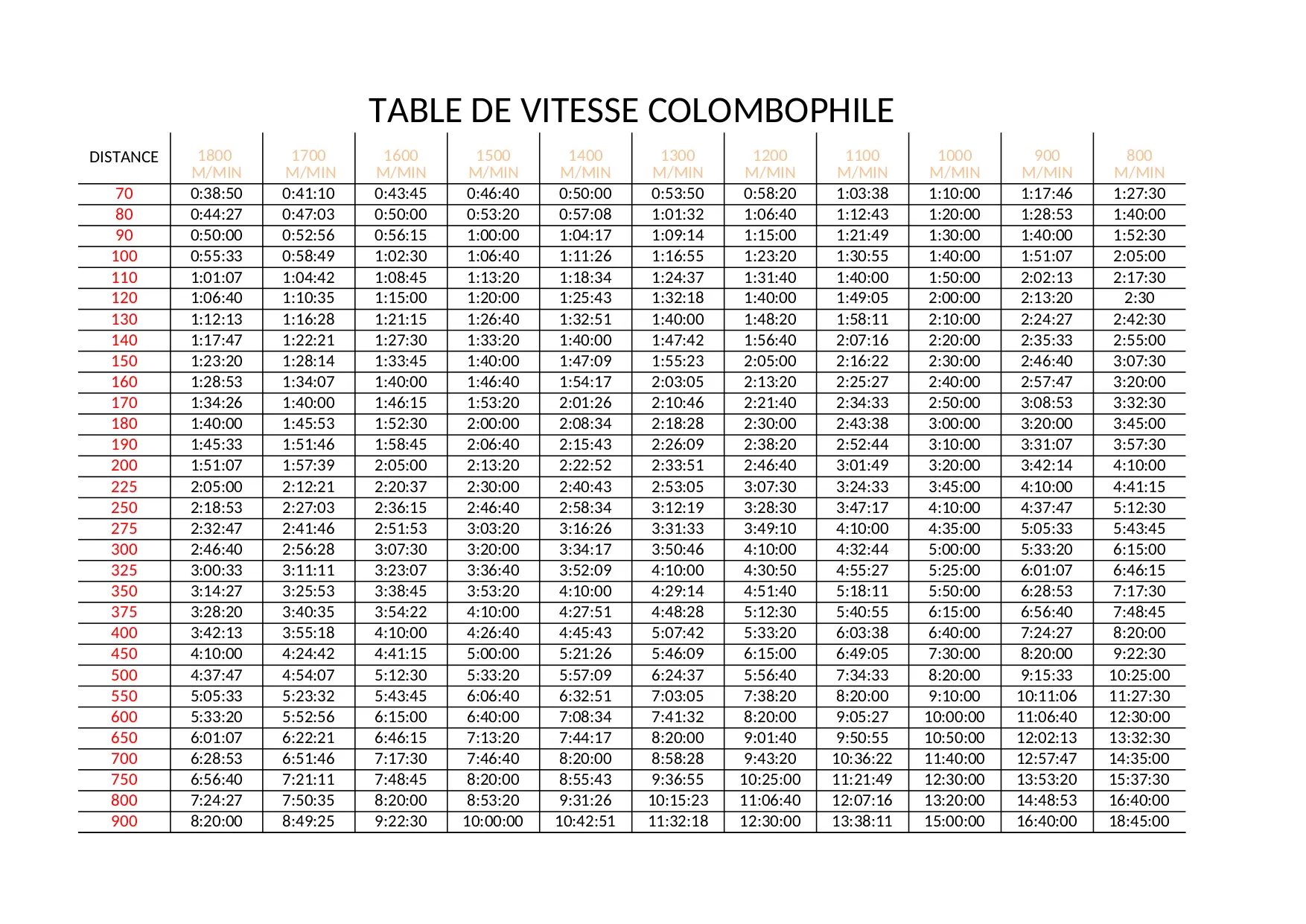 distance table vitesse colombophile