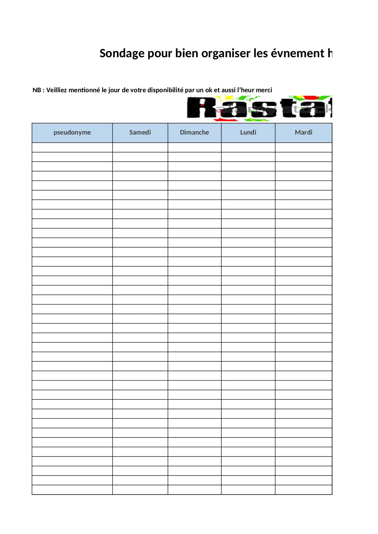 pseudonyme mentionne mardi lundi sondage votre organiser disponibilite merci samedi veilliez alliance mercredi dimanche jeudi