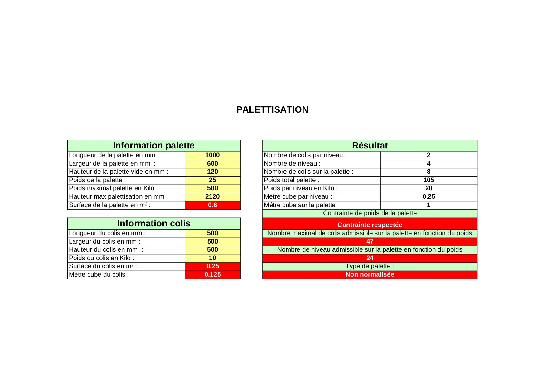 information longueur palette colis fonction maximal nombre niveau metre largeur surface poids hauteur admissible palettisation