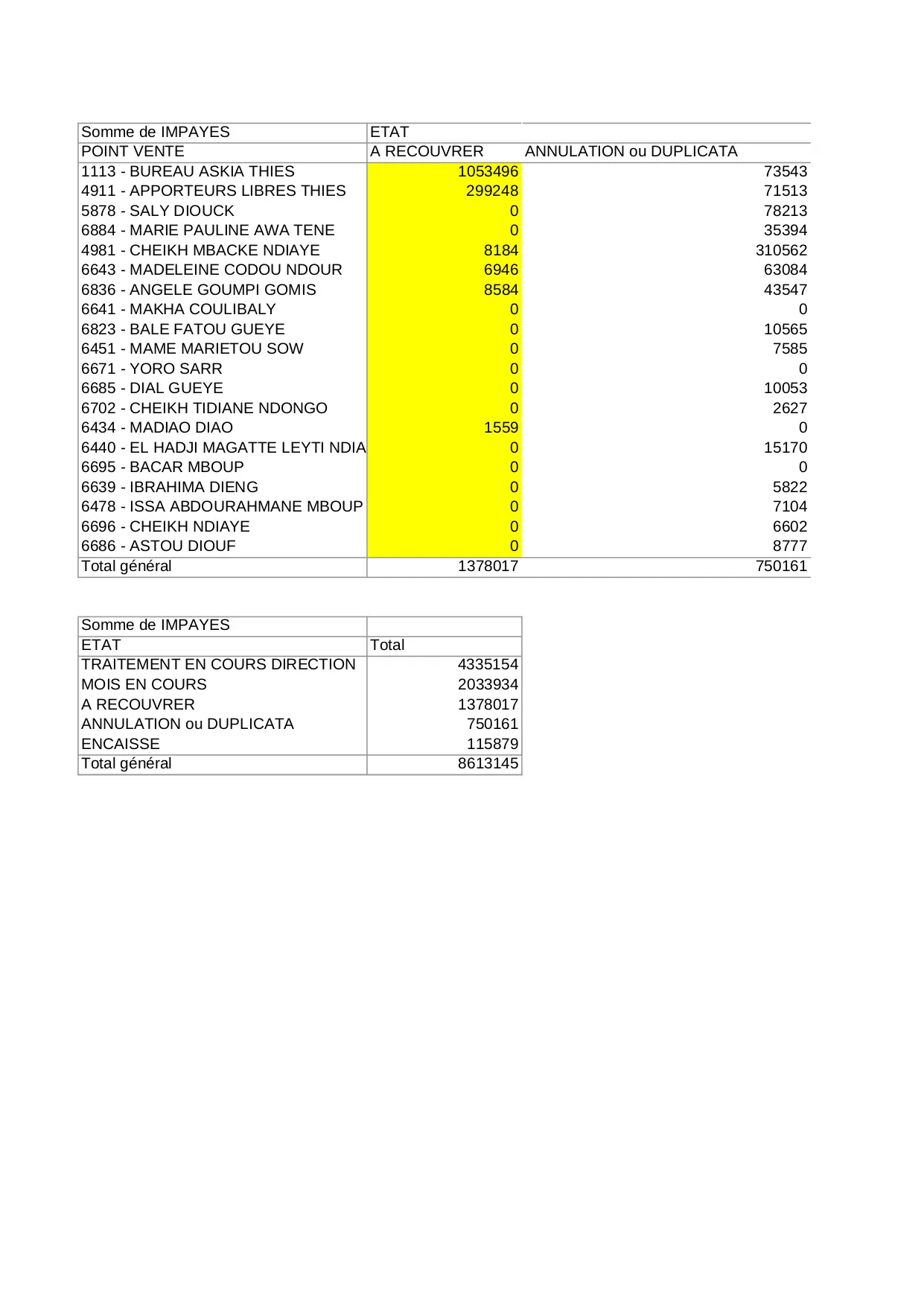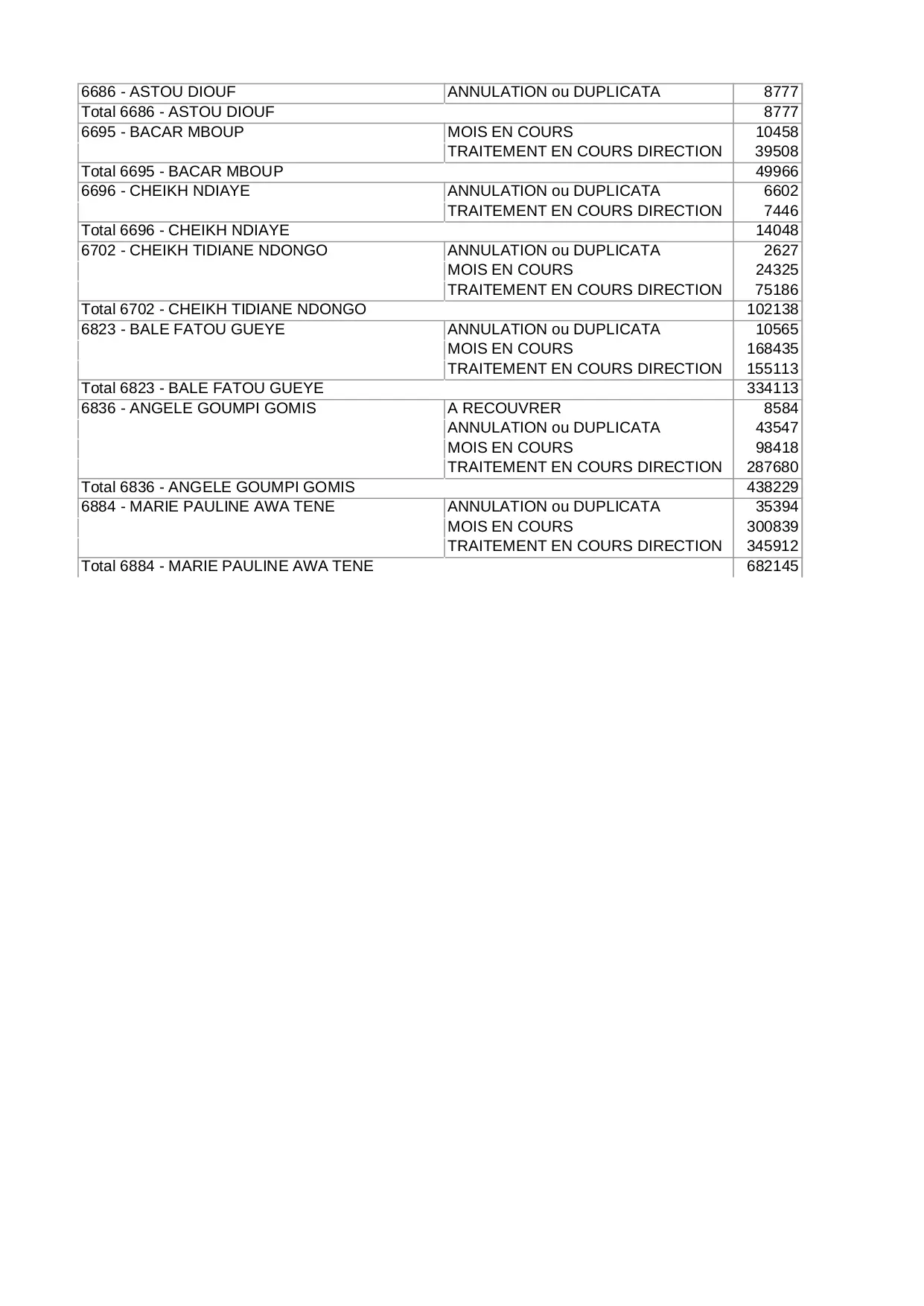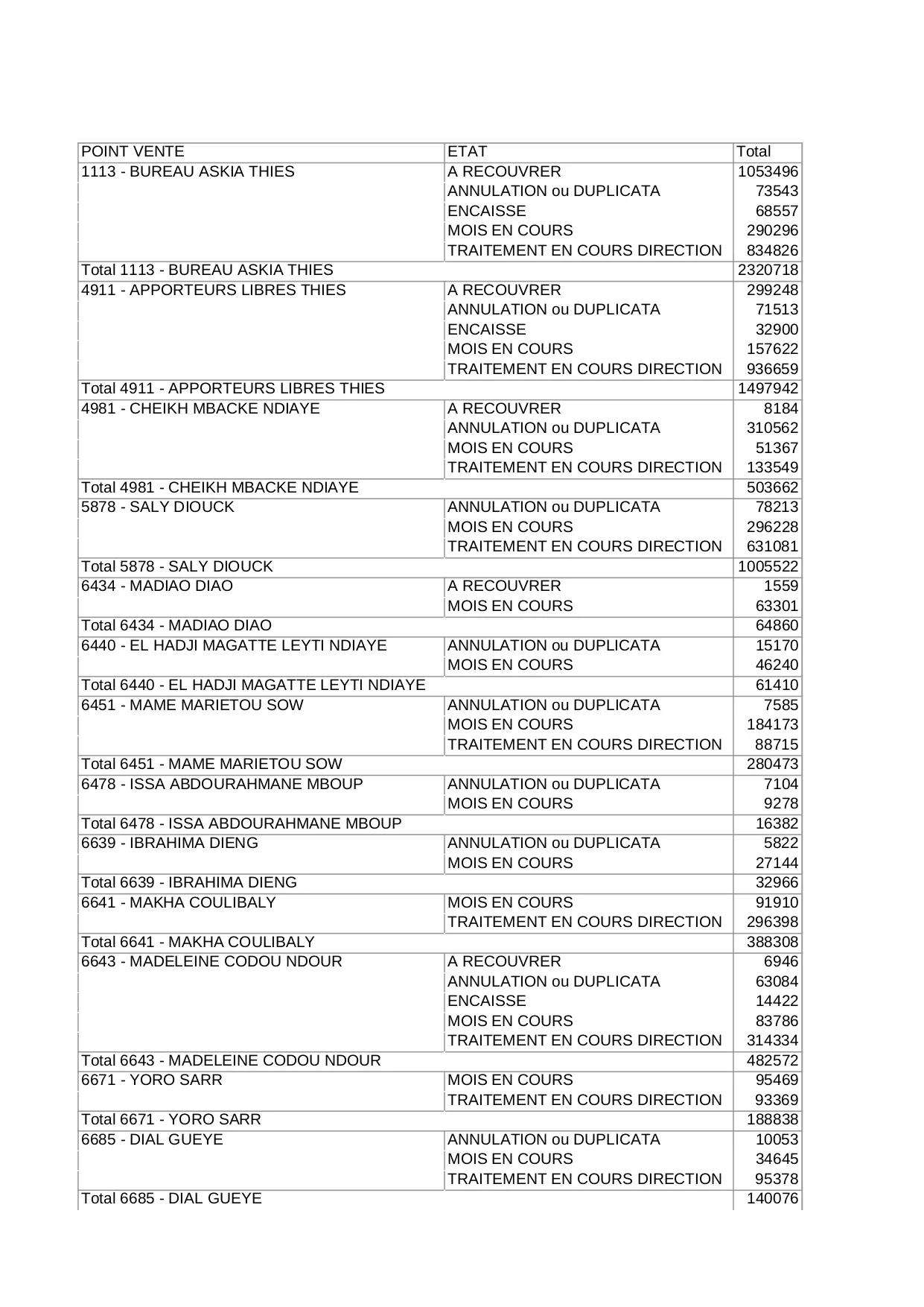 annulation impayes total duplicata somme general traitement ndiaye direction cours gueye mboup thies encaisse cheikh