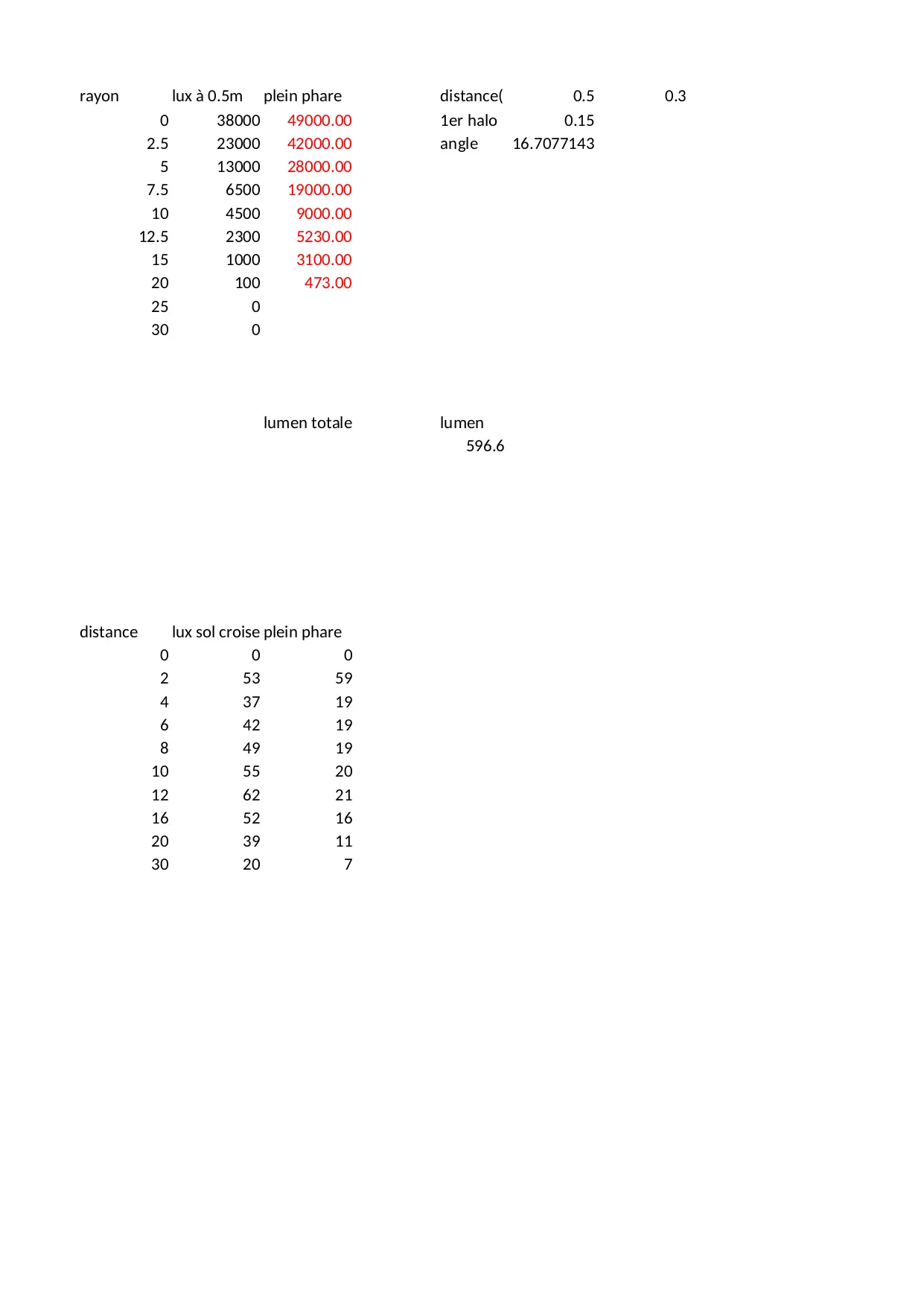 totale plein rayon courant phare angle croise lumen tension power temperature distance